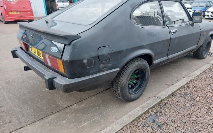 Ford Capri 2.0 Laser which we took as a trade in. Its a bit "Mad Max" but starts and runs , looks a fairly solid shell, but will need work. It may have been used for a bit drifting as it has one of those massive hydraulic handbrakes fitted. We dont have the V5.