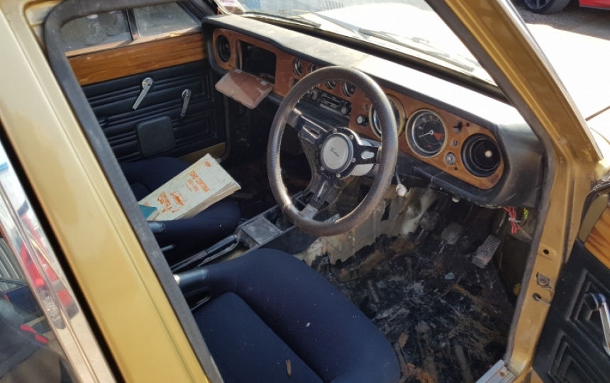 Interior - Original front seats are missing. Rear seat looks decent. Door cards , are useable. Wood will all need refurbed.  Original steering wheel is in the boot.
