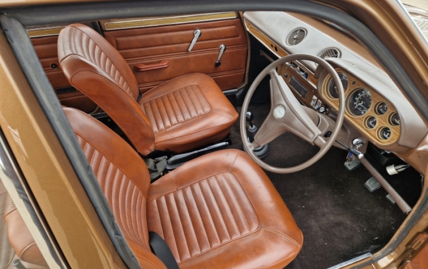 Body - 4 Door 1300 GT which is built on a strengthened shell. Body is very solid from front to back. Paintwork is lovely in its original Tawny Brown. Bumpers and grille look like recently replaced items. All chrome is good. Very straight good looking little car. Underneath is an underseal finish and not detailed or body coloured