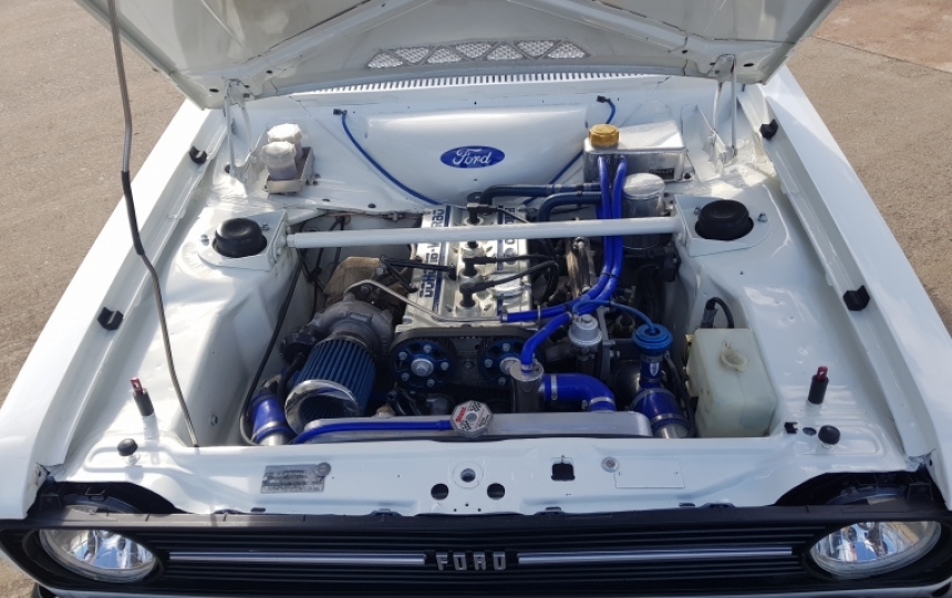Body - Built from strong original shell which is still on its original wings, front panel, inner wings, floors sills etc..Car has been strengthened with group 4 plates under the bonnet and on chassis, extra chassis skids fitted like RS models.Tunnel modified to take T5 cosworth gearbox. Otherwise it doesnt look to have had much, if any repair work done. Painted in diamond white with RS 1800 decals . Has the opening quarter windows which are in good working order similar to genuine car. Stone chipped and body colour underneath. Car is very straight along the side with good panel gaps. Rs rubber boot spoiler, Rs mirrors, upgraded headlights. F.O.R.D grille