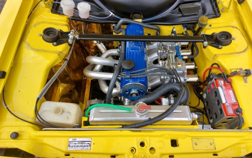 Mechanics - 2.0 Pinto which was built by Jem engines. Not sure on the spec internally but Im told it has 160 bhp and after driving it Id say thats about right. The engine has just been run in and is basically new. Its running on new Twin 45s, , Alloy Rally Fuel Tank, Straight Cut 5 speed gearbox with Quaife internals , LSD, single leaf rear springs , car polybushed throughout, quick rack, strut brace, silicone hoses, alloy radiator, ashley exhaust, new prop, 1 inch lowering blocks, new hel brake lines, new handbrake cable, bilstein rear shocks, alloy sump and bellhousing, new gearbox mount, willwood front calipers, vented discs, front coilovers, lightweight race battery, bias pedal box,