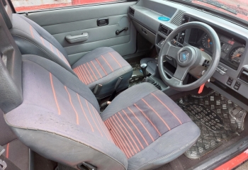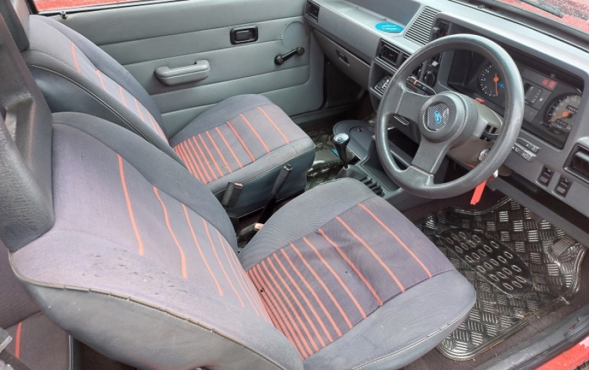 Interior - Red strobe style seats in fairly good condition, Door cards have had speaker holes cut then blanked..Good headlining. Dashboard has been changed to the hard type. Correct XR3 dash clocks and steering wheel.