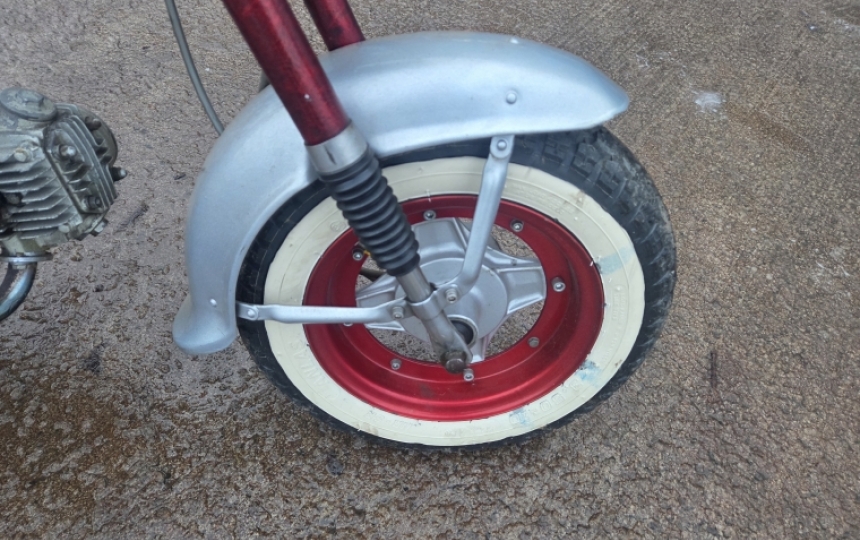 Original 1974 Honda Dax ST70. Custom paintjob, whitewalls. recovered seat but dye flaking on side of cover. Does start and run. Have the V5 here