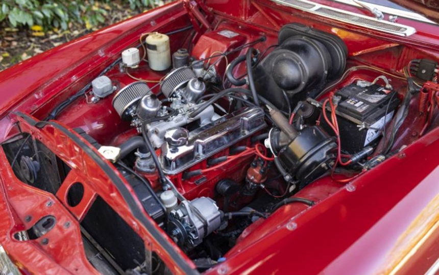 Sits on Minilite alloy wheels with nearly new Michelin 195/65 R15s. Has the original engine, fitted with fully rebuilt SU HS6 Carbs by renowned expert Glen Watson of SU Carbs. Engine is lively and pulls hard, being able to keep up with modern traffic – sounds pretty good too.